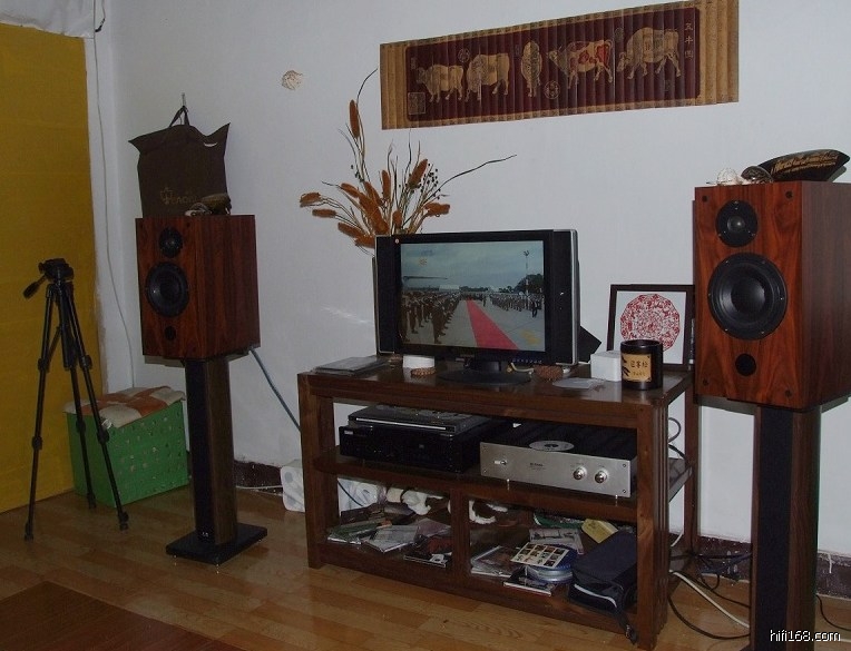 按照同事或者朋友的说法,我是脑子里进了水,没事就搞音响这东西,钱挣得不多花在音响上时不手软。还好在这条路上入门不久就开始整了套还算过得去的门槛组合,一下子从几百元的DIY音响加当时炒的T2024升级了,前段时间因为搬到单身宿舍后,空间变小,音响声音不大好,在此坛子发过帖子请教过,版主和几位热心朋友的建议下,偶调整了下音响摆位,添置了点物件,挂了张纯羊毛毯,声音有改进,最近工作忙,一回家靠在靠枕上听音乐,什么疲劳都没有了哈!,上一张调整摆位和挂东东以后的照片,在此谢过几位给过建议的朋友!