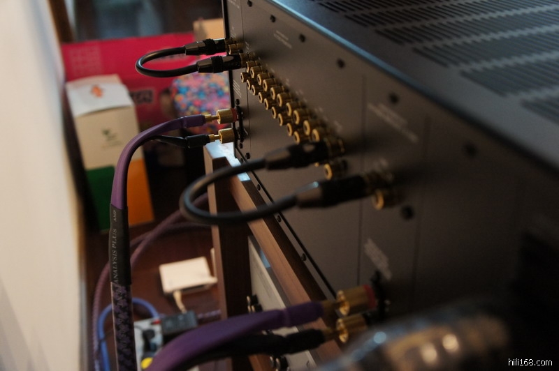原厂配了一对很短的信号线,从前级的Pre Out口接到后级的Amp In口。通过换这一对信号线,也可以调整声音。记得音乐传真的M3合并机也是这样设计的,只是M3合并机的这段信号线在机箱里面,必须打开盖子才能更换,这一点2150就方便多了。