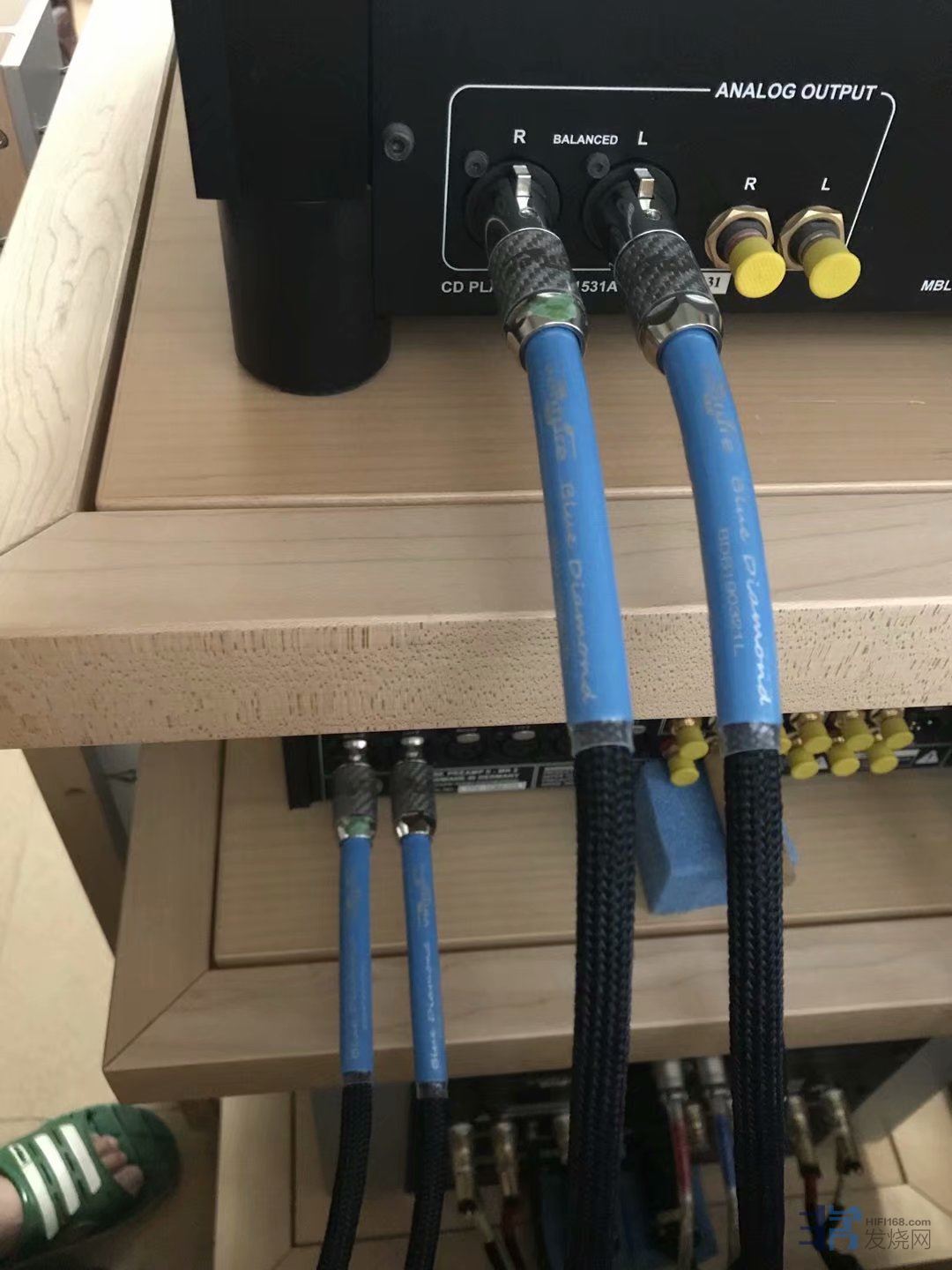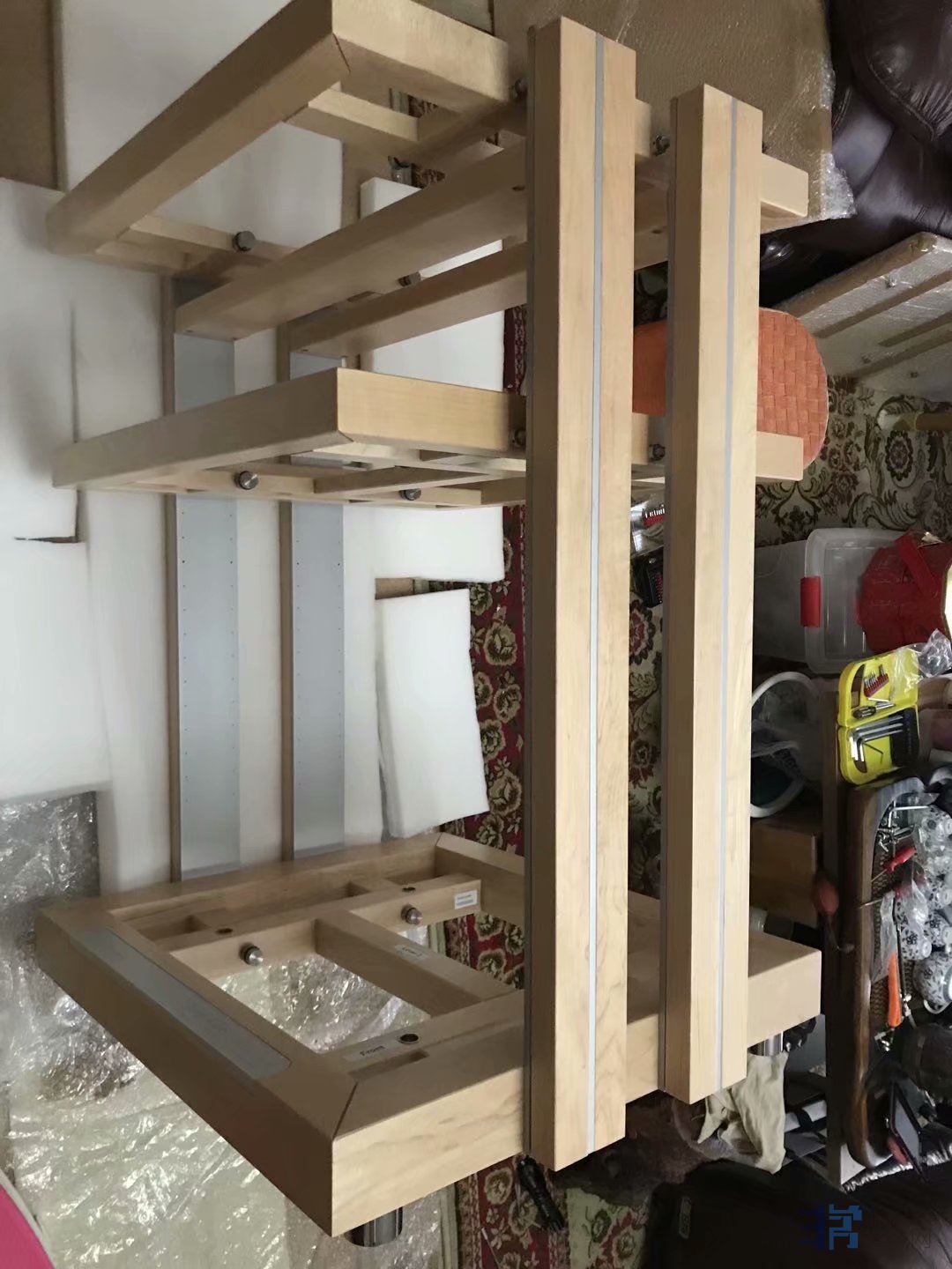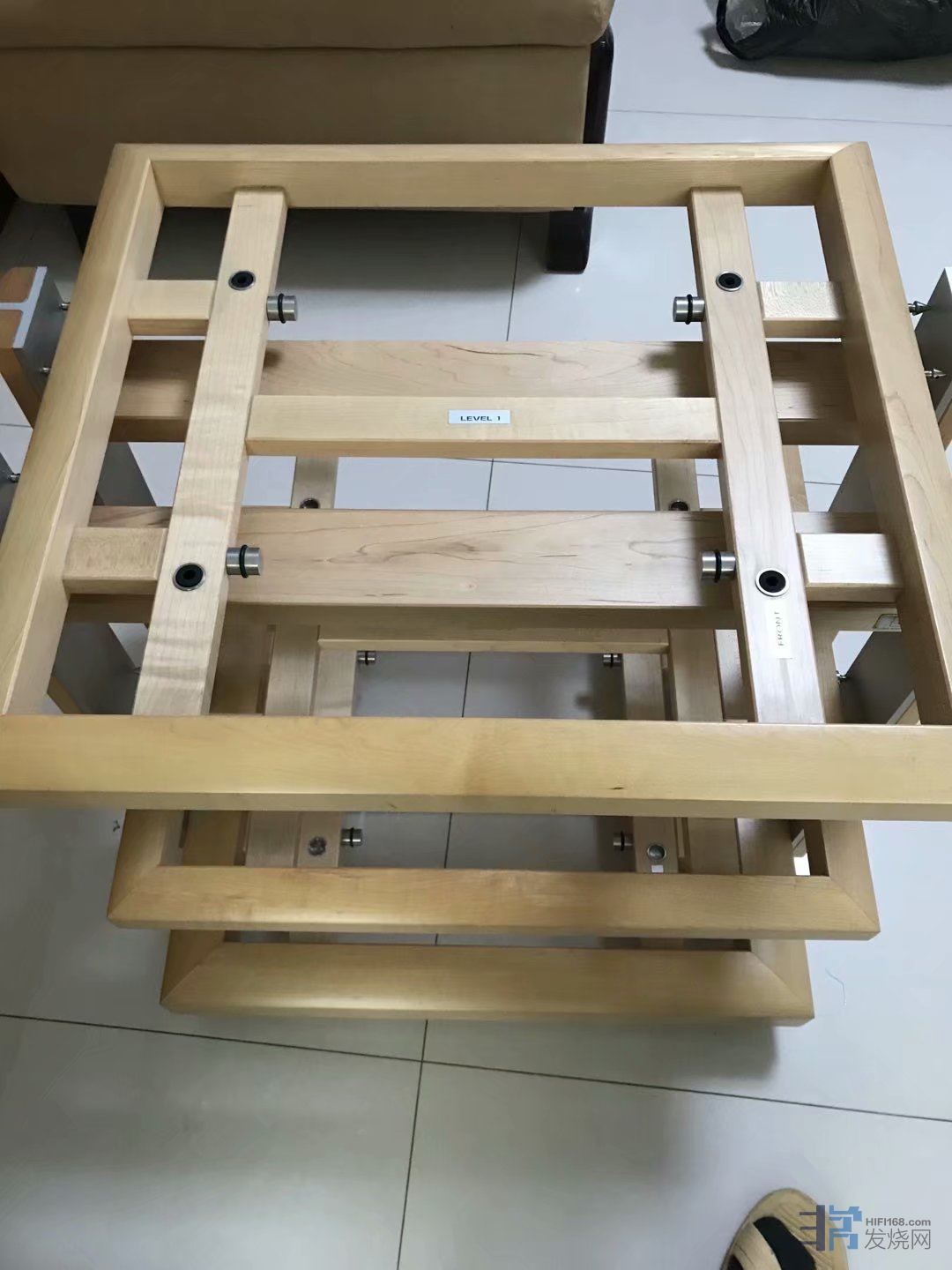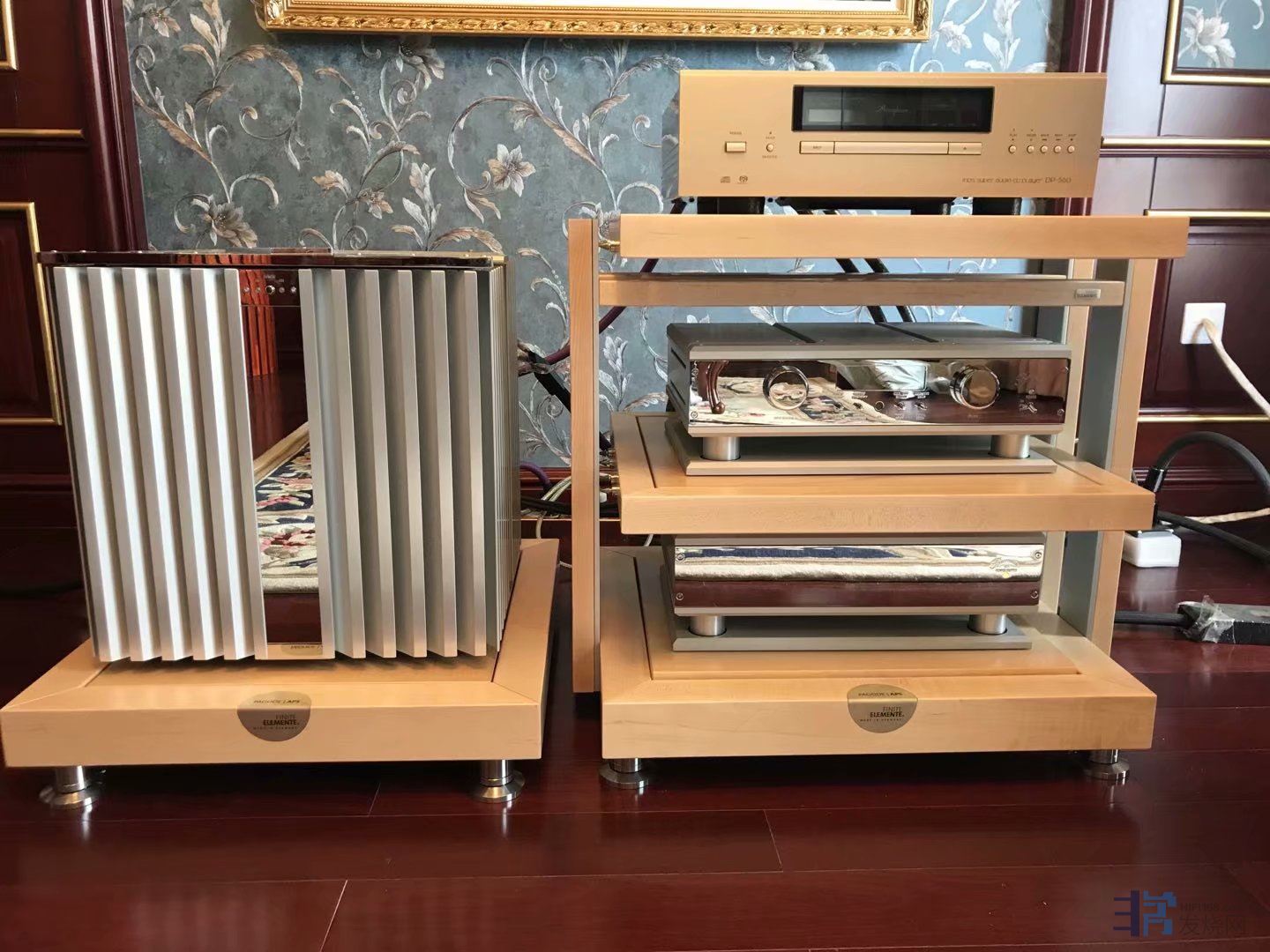这期间我朋友北方再次偶然在闲鱼上看到上海烧友有出二手原装参考系列HD02三层FE枫木原色机架(立柱包木),直接拿下,秒杀,上海烧友也是两套FE机架,一套德国原装FE三层机架,一套广州复刻的山寨FE三层机架,上海烧友告诉我朋友北方,山寨和原装外观接近,但是效果差距巨大,朋友北方因为运输费用问题,没有买山寨FE,只买了德国原装FE机架。