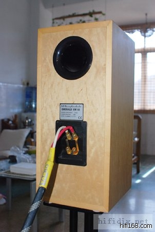EM93属于乐富豪音箱中较为高档的品种,箱体三文治结构。它以低音倒相式设计,设有双线分音接线柱。此箱的体积较大,面板上贴有真木皮,造形较简洁,反射气孔设在声箱背板上。EM93摆位时对后墙的反应极为敏感,在有良好吸音设计的房间内,要把EM93远离后墙接近1.5米才能获得清晰的代频。EM93虽然是英国制,但它并没有浓厚的英国音箱风格,它的音场较为宏大,由于箱体较大,EM93的低频从容度、下潜力是普通小音箱无法提供的。神经质高频伸延有些不足,而且在超高声符、量大时还带点硬朗感觉,但总的看来,它的高、中、低频表现较平衡,没有高低起伏,抑扬顿挫等特性。EM93的分析力普通,播放大场面的音乐时控制力也一般,没有什么特别出色之处,播放一般的爵士乐与流行乐曲效果最佳,同时要求功放有一定的控制,如能配合胆味充足的A类机相信效果更好。