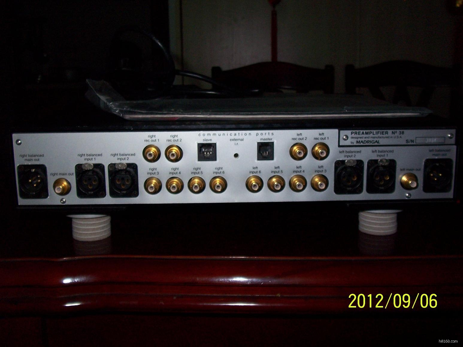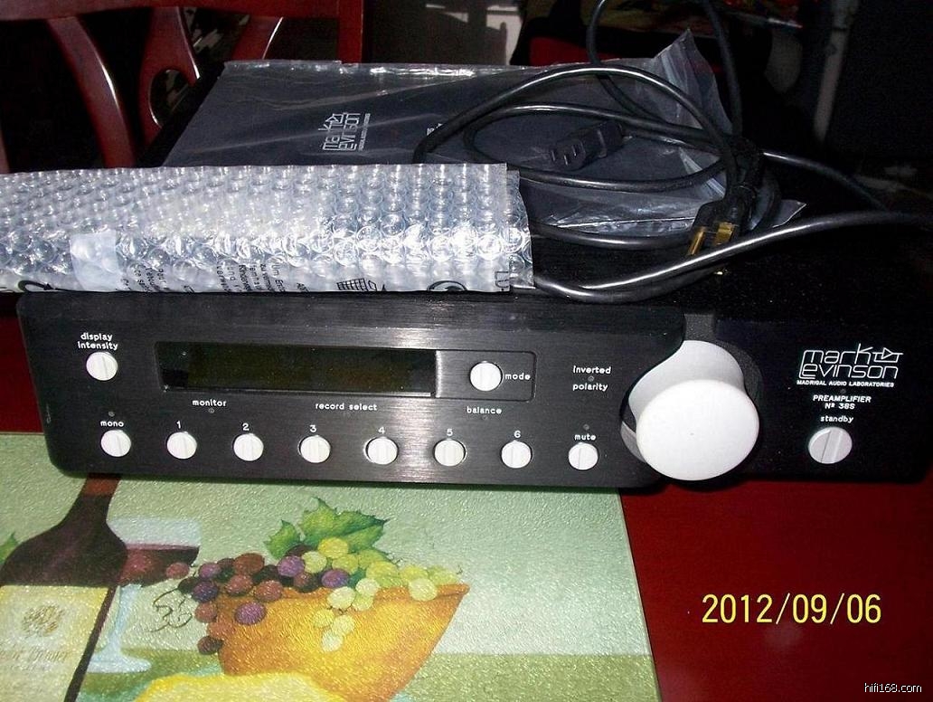 1、马克·列文逊NO.38S前级(Mark Levinson NO.38s preamplifler),2012年9月二手购入,成色8.5-9成新左右,编号靠后,为3XXX,无任何修摩和外观瑕疵,声音状态完好,原包装和遥控器、说明书等完整,美国版,出厂设置电压为100V-120V/电网频率60HZ,通过朋友帮忙用跳线改为了国内标准的220V-230V/50HZ(跳线开关及电源插座在机器底部中间,原装跳线盒单独存放保留着的);该机设计为待机设置(保证声音一直维持正常状态),没有电源开关,必须拔掉插头才能断电,如果断电后重开机需要1个小时以上预热才恢复正常状态的声音,注意由于是改装的电压和电网频率,开机启动后自检需要十几分钟到1个小时不等,要视用户当时所在地的电压稳定情况而定,所以平时最好处于待机状态,不要轻易断电,也是为了保证好声的需要。该机为真正全平衡放大甲类设计,声音中正、大气、开扬,三段平衡,高密度。明盘报价2.1万元人民币。