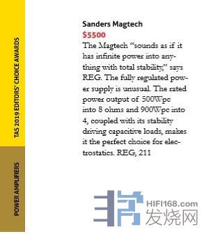 美国sanders(桑德斯)MAGTECH(大力神)后级。美国桑德斯是静电音箱的鼻祖,MODEL10获奖无数。但是静电音箱难以推动也是不争的事实。因此厂家推出了大力神后级,以推动MODEL10音箱。大力神后级有一个专利的电源管理系统,(在播放人声及小音量下变压器输出功率减少到50%,当播放交响乐时变压器才满功率输出)。大力神后级输出功率500瓦(8欧)900瓦(4欧),增益26dB.(具体参数请至官网查阅)。