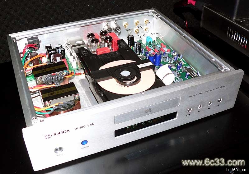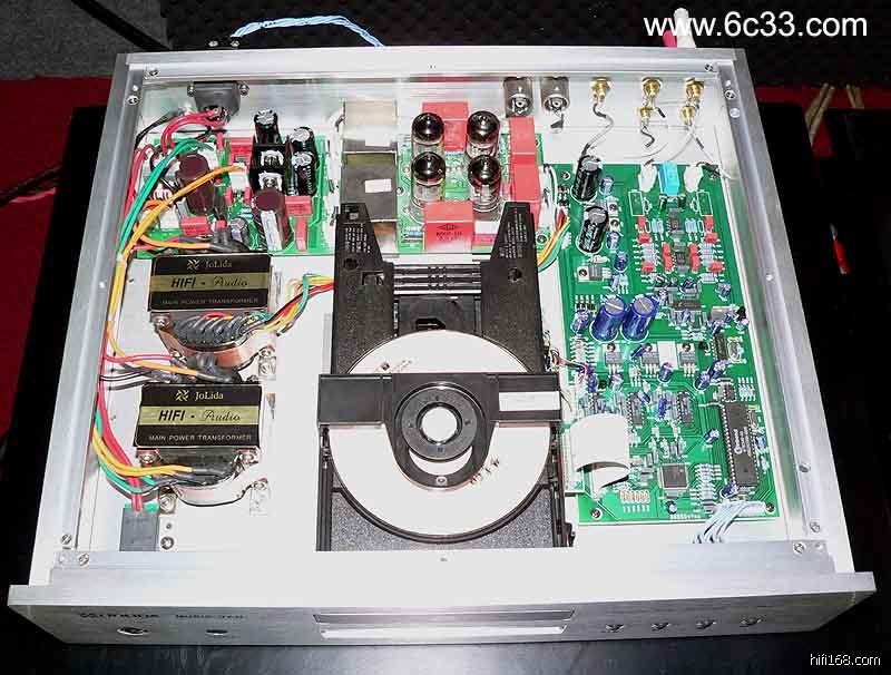 虽然这第二代MUSIC VAN内部设计结构与上一代并无二异,如出一辙,但我依然忍不住再详细打量一番。MUSIC VAN的布局基本一分为三,满满分布的元件让人一看就信心十足,居左位置醒目可见两个JOLIDA特制的Hi-Fi级方型变压器,靠机箱后部的一块线路板是电源整流以及滤波线路组合,两只变压器其中之一负责供给转盘、解码、晶体管放大电路,而另一只则供给电子管放大电路,也就是说,MUSIC VAN是一台具有电子管音频输出和晶体管音频输出的CD唱机。     中置机芯设计的MUSIC VAN居中前端自然就是它的转盘了,该机应用了PHILIPS osmic L1210转盘与VAM1202/19光头组件,并且对整个转盘机构进行了加固稳定处理,做法是在机箱底盘与转盘之间附加一块厚重的铝板,这也是大多高级CD唱机乐于采用的做法。转盘后部位置是一块独立的电子管放大线路板,在线路板上可见到两个银光闪闪的输出变压器,前后左右观察,未见有任何铭牌标识,据说是专业领域的高级用品;该电子管线路应用了双三极管的特性来成就全平衡模拟放大输出,昂然挺立的四枚电子管均加套金属屏蔽罩,可以最大限度地减小干扰;电子管为俄罗斯ELECTRO HARMONIX产品,其中两枚12AX7、两枚12AT7,很明显,在MUSIC VAN的机箱背板可见有一组平衡输出端子,当然,这个电子管线路同时也备有一组不平衡的RCA输出。