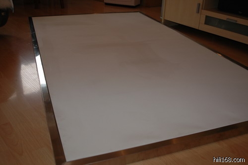 自制的零增益120寸(2.37x1.34m)投影屏幕,不锈钢框架。