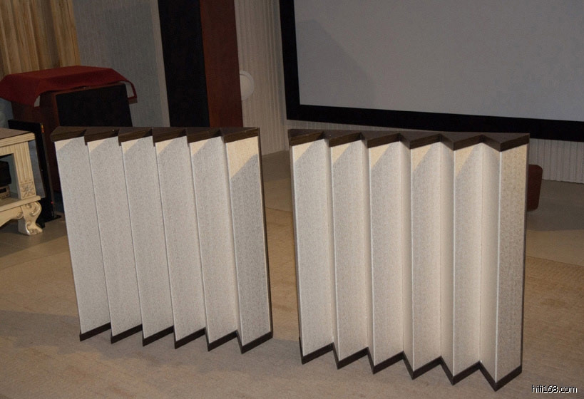 二、吸音板2块。锥型扩散板,尺寸:61cm x 61cm; 锥角高度12.5cm 。摆放在适当反射点,令整体声底干净,人声咬字清晰,中高频细腻厚暖。弦乐表现感情丰富,松香木味浓郁,适用于长时间聆听。 全实木制作,锥角外包有一层麻质不规律纹路布料,避免了其光滑硬性平面的规律反射造成的中高偏亮的情况。利用双V空腔震动的计算设计让其整体产生细微共鸣,整块板分为6个独立三角锥形,内置适当比例的吸音材料。防止多余声波残余造成频段重叠。 成品制作工艺复杂,在早期传真图纸制作样品测试时。在放置吸音材料的比例及锥角角度空间尺寸都花了很长的时间调整。http://bbs.hifi168.com/showtopic-116730.aspx