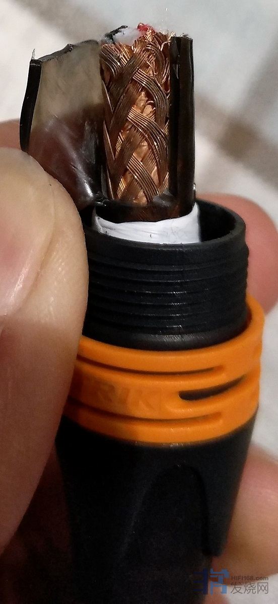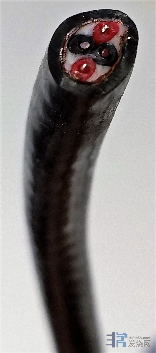 此线,用料非常奢侈,每个极有两根0.8mm的单晶铜单独绝缘构成。线身标明纯度6N,单晶铜,铜箔屏蔽加铜网。内部棉线避震,最外部的绝缘层非常特殊,不是通常的橡胶,是一个半透明的物质,这种绝缘层我个人只在天仙配的参考级电源线上看到过。