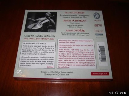CALLIOPE出品,法国大提琴家纳瓦拉(NAVARRA)演奏舒伯特“Arpeggione”大提琴奏鸣曲、舒曼5首民歌,以及德沃夏克大提琴作品。珍贵录音!赠送CALLIOPE公司2006年精美唱片目录一份。立体声录音,全新仅拆,CD无划痕无使用痕迹,纸盒崭新。