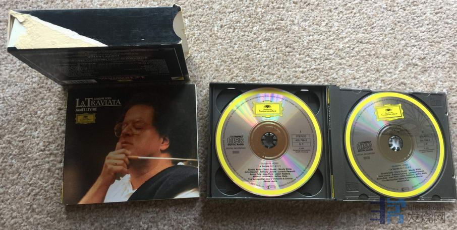 DG 李文 茶花女 比半银圈大一点,全银圈小一点,内圈made in germany,01首版无ifpi,CD1一些浅划痕,播放没有问题,CD2基本无划痕,外盒有一处破损,80