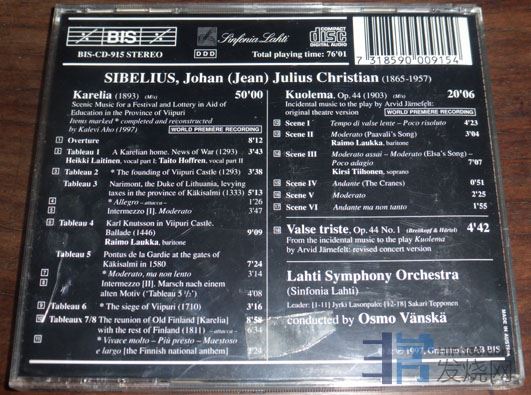 71.万斯卡指挥演奏西贝柳斯卡累利亚全曲、库奥莱马戏剧音乐。奥地利DADC压盘,轻微使用痕迹,外壳右上有处小裂痕,小册子右侧上下有两处卡齿印 60元