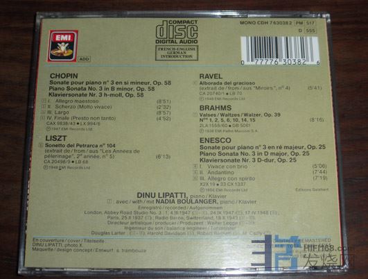 73.利帕蒂演奏肖邦/勃拉姆斯/拉威尔/李斯特/埃乃斯库作品,Made in UK,SWIDON压盘无码。碟片些许细痕,播放OK小册子右方有两个点状压痕,盘芯卡齿断了两个,可以固定住CD 80元