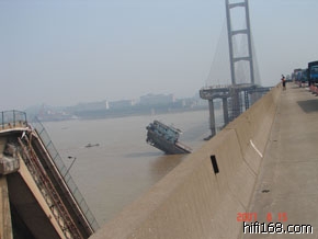 广州日报大洋网记者一早赶赴到事故现场,大洋网记者在第一时间连线前方记者。据记者了解,九江大桥南桥段有近100米的桥面垮塌,坍塌的桥体呈45度插入水中。抢险部门表示,事故怀疑遭一艘运砂船撞击桥墩引起的,目前船体正倾斜插在水中,露出部分船尾。