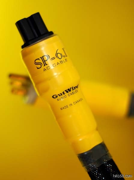 拔下插头将线掂在手里仔细观察,头尾是鲜艳的明黄色,这种色彩很讨我的喜欢。说句实话,我觉得目前大多数音响器材的设计都过于呆板、老套和沉闷。即使偶然出现颇具品味的外形设计,要么败絮其中、要么就是天价般的昂贵。就此而言,作为不会有什么突破性变化的线材,吉威的形象可谓是颇具特色,堪称线材中的“型男”。该电源线插头部位赫然印着SP6.1的型号,据说SP.1系列是吉威推出的最新版本,往上还有SP8.1和 SP11.1,价格自然也是随之上涨,而SP6.1的折实售价是六千多元人民币。这个价位带可是各大品牌纷争之地,究竟吉威有何能耐?我们一会儿再去揭晓。仔细观察后发现,SP6.1线身极其柔软、轻盈,由于三根线均为独立的屏蔽层,并且松散的辫在一起,所以显得整体很庞大,但是却很柔软,可以不受约束地随意弯折,这样以来就为器材架背后的空间做出了很大的贡献,不会像很多电源线一般——坚硬的好似钢鞭。