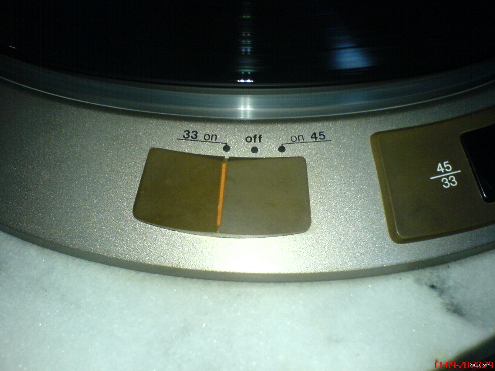 今天突然发现LP唱机打开转盘后,有交流声从音箱中传出,关掉转盘则没有,把转速拨到45转时也没有电流声,怪事!如果是马达少油或是机械磨损,应该不管是33还是45都有电流声才对呀!