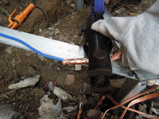 自己急于把外面的地线埋好自己想当然的把6平方铜线用缠绕的方法紧密绕在铝棒的穿孔处。。。
