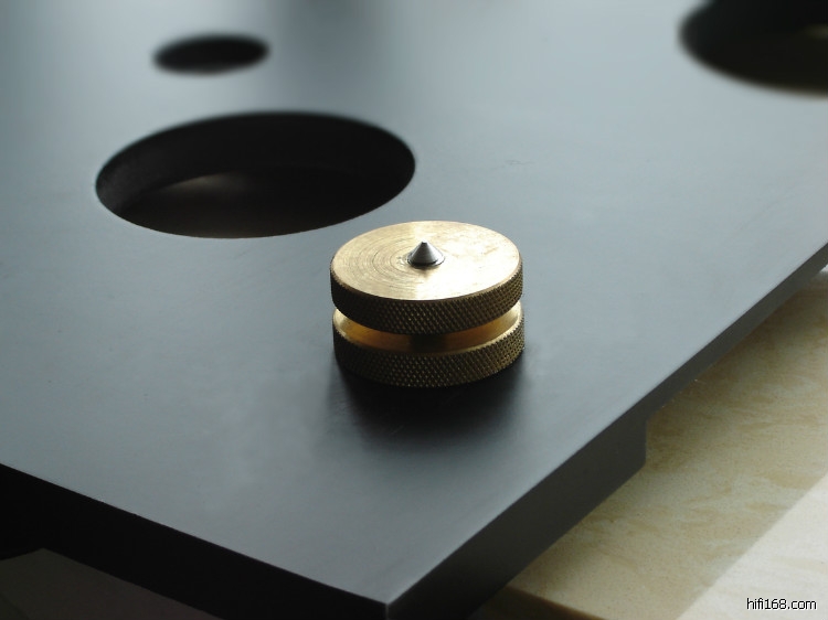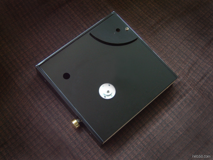 这套系统就是一体机参考唱盘升级“空军一号”,拆去参考唱盘内的马达(唱盘台面的左后方还能够看到一体机安装马达轴头的圆孔)。
