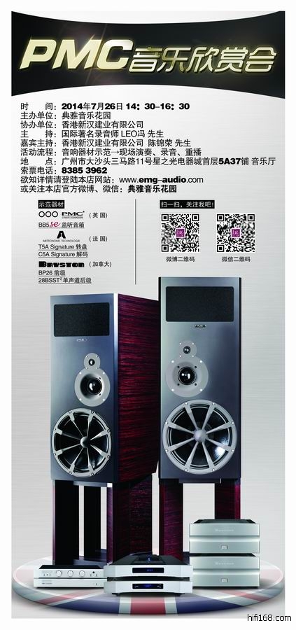 2014年7月26日典雅音乐花园将会举行国PMC音乐欣赏会,活动现场将会播放多张极具珍藏价值的CD软件让各位爱乐人士可亲身体验来英国HI-END品牌PMC BB5SE音箱、法国Metronome文豪T-5转盘、C-5解码、加拿大BRYSTON百事通BP-26前级、C-28SST2单声道后级的真正实力!门票有限,有意者请到典雅音乐花园免费索票!活动详情可浏览本公司网站:http://www.emg-audio.com/