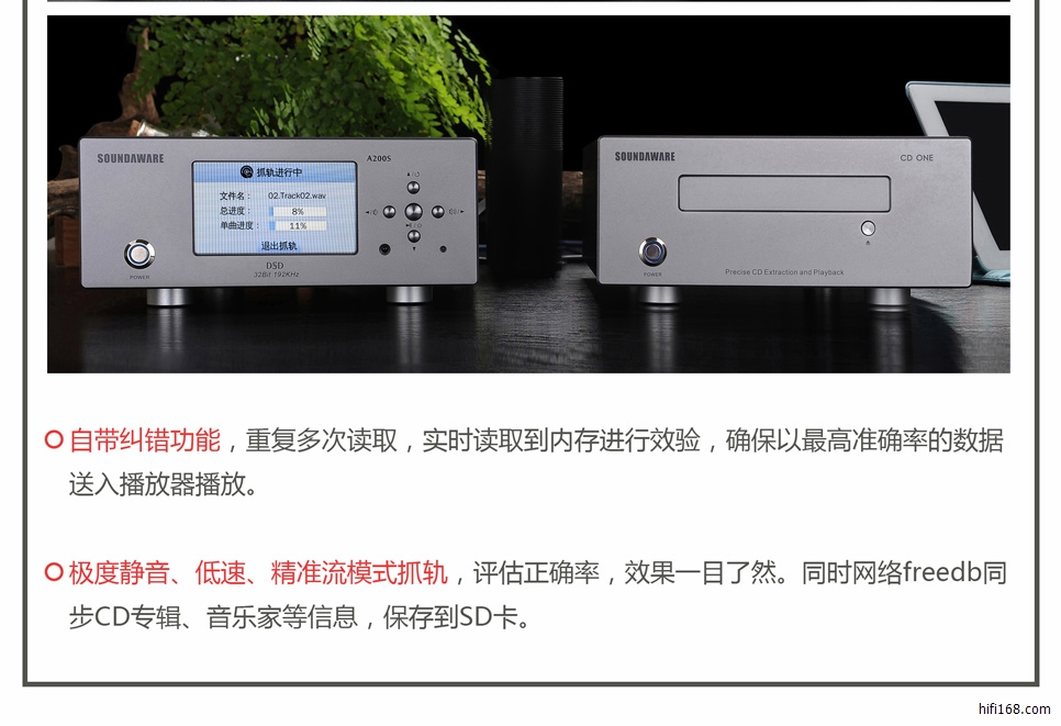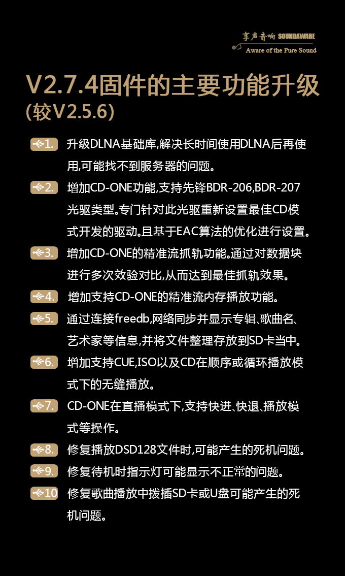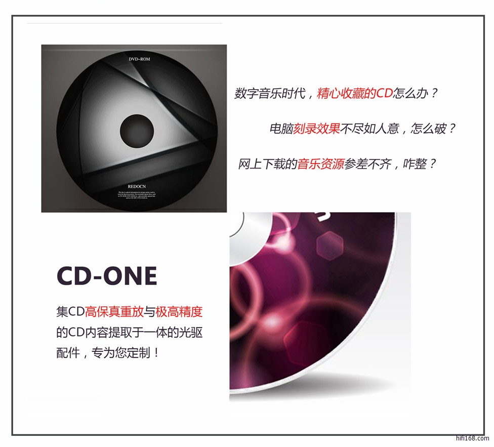 CD-ONE是我们针对V2.7.4以及V0.9.5固件开发的一款CD精准无缝播放、抓轨的参考豪华光驱配件产品,同时如果您无法购买到CD-ONE,也可自行购买先锋BDR-206或BDR-207的光驱接入享声所有的台机进行使用,从而您便可以体验到享声V2.7.4以及V0.9.5固件对于CD支持的所有功能。