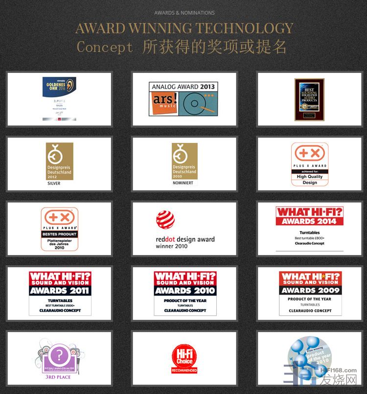 当你想入手一个东西的时候肯定会参考很多网站杂志等,如果只有一家说它好,那它可能是广告,但是如果每一家都说它好呢,Clearaudio concept就是这样的,它横扫从美洲到欧洲到亚洲的音响榜单,并连续三年拿下 WHAT HI-FI 五星大奖。