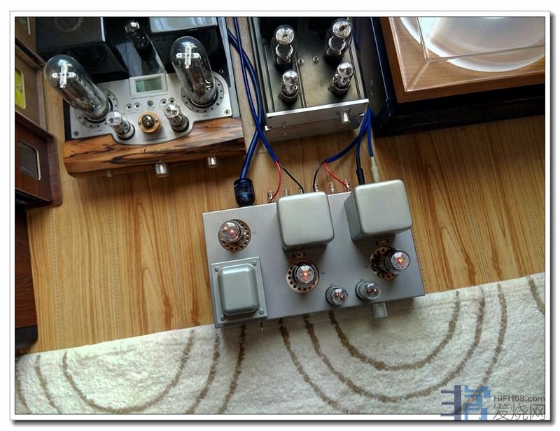 注意,入门烧友不要学我这样让胆机空载,搞不好会造成输出变压器回输、烧掉后级功率管。我主要是玩了胆机十几年,属于胆校除名自学成才之流;拿掉了信号输入、关了音量,且机器本身有负反馈,就狂妄且过度自信的这样乱来。