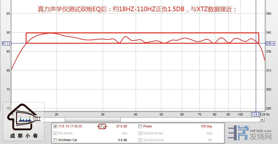 真力声学仪测试双炮EQ后,约18HZ-110HZ正负1.5DB,与XTZ数据接近;