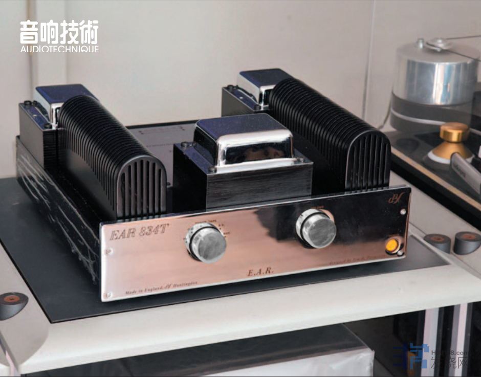 EAR以834为名的器材有834合并放大器,834P唱头放大器,834L前置放大器,都是以真空管作主动元件的。 而这部834T合并放大器,却是用晶体管的;T自然是指Transistor,晶体管。834T与834在外型上是没有分别的,用同一机箱,只是在834T机顶两旁原为保护真空管用的罩,里面并没有真空管,只作为装饰之用;而三只有银色外壳的变压器仍很抢眼地在原位闪耀,前方的电源变 压器固然不是装饰,后方的两只输出变压器却仍然是「有料」的,不是装饰品!所以我第一眼看到834T时,也误以为这是一部胆机!