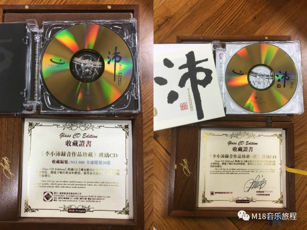 随着音乐爱好者对于音乐载体的要求越来越高,CD格式的最终也是最高价的载体——玻璃CD在历经10数年的研发后应运而生。由于用料极其考究、工艺极其复杂,精度要求极高,玻璃CD只能由人手单张制作,每个专辑一般不超过20张,因而价格非常昂贵,通常在万元以上。2018年以来,国内玻璃CD专辑呈现“井喷”现象,这次龙源唱片旗下四张玻璃CD倾巢而出:《沛》、《沛·续》、《毛阿敏·天之大》(各限量20套)及《红色娘子军》(限量10套),近距离品鉴珍贵的玻璃CD,为水乡音乐文化活动增添闪亮的光彩!