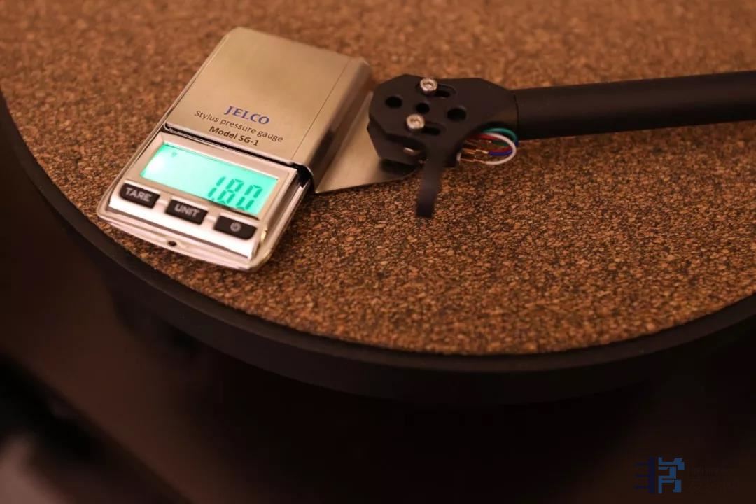 在进行这项调整之前,请转动唱臂后面的重锤,将唱臂归零、针压归零,然后略微施加针压(不必精细,初步调整时使用略轻针压即可,例如原本1.5克的针压先使用1克做调整)。