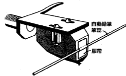 然后将唱针针尖轻轻地摆在121mm的点上(为方便说明,66mm的零点以下称为B点,121mm零点称A点),然后从唱臂上方观察唱头的外型(通常是矩形)是否与方格纸的格线平行、垂直,原则上不可以歪掉。有时候很不容易看得准确,这里有一个来自ELAC公司的小技巧:拿一支自动铅笔笔心黏在唱头上面(如上图),这样就很容易看出来唱头外壳有没有与方格纸平行了。