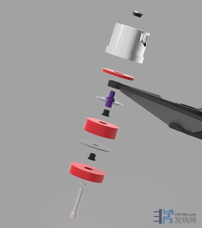 再将带动转盘的不锈钢轴套入承轴,要轻轻小心地放入,否则会伤到轴心,装好后试着用手转动一下是否顺畅。上方的螺丝座是用来跟AVID唱片镇对应锁定的,没错,AVID的唱片镇是采锁式固定的。▼