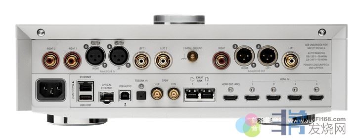 背板上半部模拟输入端计有⼀组XLR端子与二组RCA端子,模拟输出则是XLR与RCA各⼀。下半部数字端子则有Ethernet、USB Host(维修升级用)、Optical Ethernet(连接光纤网路)、USB Audio、Toslink、S/PDIF同轴RCA二组,Exakt Link二组、HDMI eARC输出,以及HDMI输入四组。