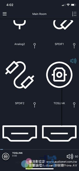 多功能圆旋钮除了选单设定,还可以调整音量(100阶),也可以设定Standby(Sleep,整个按下去二秒钟,圆旋钮上的灯光消失)。如果要唤醒,按圆旋钮任何⼀个方向都可以。要选择输入端,只要按箭头下↓,找到输入端List,再旋转圆钮选定输入端即可。Play、Stop或Pause正在播放的音乐呢?只要按中央⊙即可。如果要播下⼀轨或前⼀轨呢?这就要用箭头右→与箭头左←。