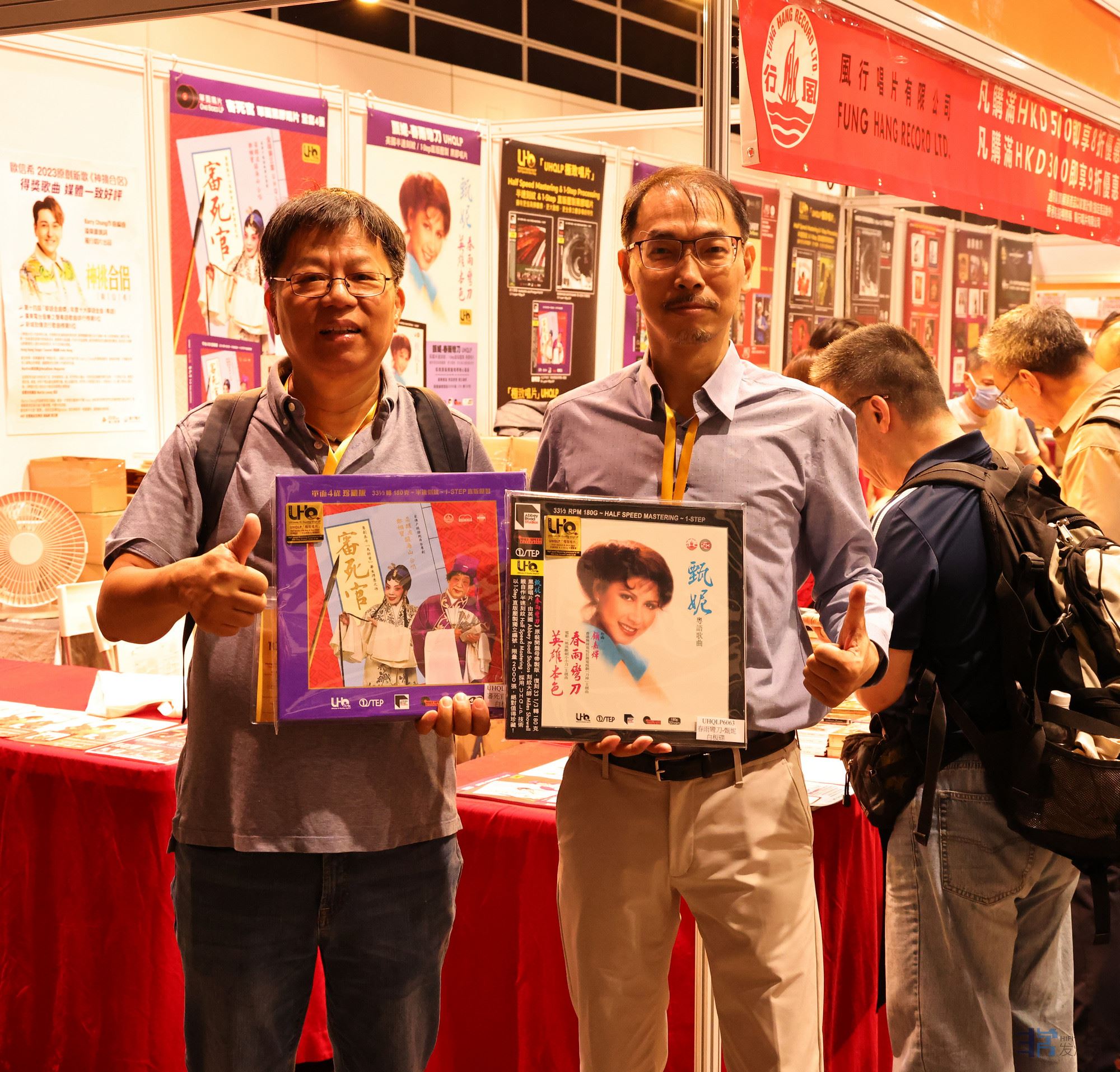 UHQLP是风行唱片最近研发出一个黑胶新制作方式,是我认为目前最好的黑胶唱片格式了,下图是AQCD科技的程总和风行唱片的林总分别展示这两款黑胶唱片。