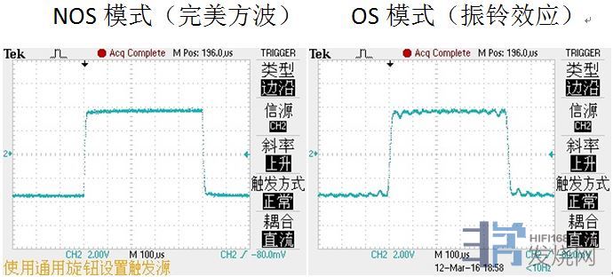 NOS模式声音细腻、柔和、顺滑,最能表现出R2R的特点和优势,但对声音的控制力弱,高频和低频延伸变差,音场宽度收窄但深度增加,声音的凝聚力下降(声像聚焦略为发散,声线比较模糊);而采用OS模式,声音的细腻、柔和、顺滑会有所下降,略带点轻微的毛刺(据说是超取样带来的振铃失真),但声音的控制力大大提高,高频、低频延伸很好,音场宽度拓展(但深度略变浅),声音也更为凝聚,定位更为清晰、准确。