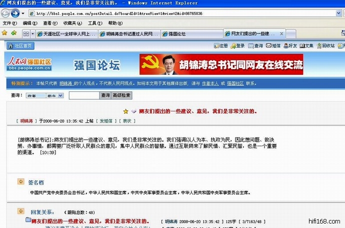 谢谢总书记。各位网友,因为胡锦涛总书记接下来还有其他的活动,在强国论坛同大家的交流就到这里。
