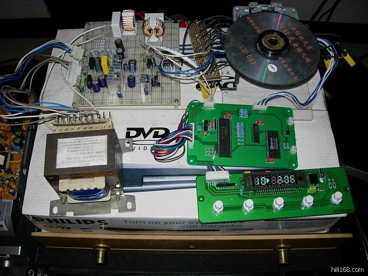 俗话说,木匠家中没好家具,象老浦东这样整天乱折腾的人,再好的外观也是白搭。所以就拿个DVD机的包装箱当底板,上面乱七八糟放上各种部件,就是台大名鼎鼎的CD-pro2鸡鸡了!!!