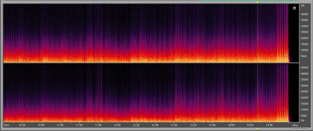 可以看出24bit-96kHZ之LP-WAV音频频响明显要宽,高频达到了32kHZ,听音感觉也是如此,CD音频实际上将22kHZ以上的高频截掉了,严格意义上来说,CD音频并不是无损音频。