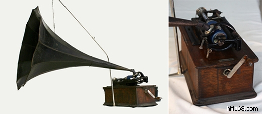 1877年 爱迪生发明的第一台留声机,可以将声波变换成金属针的震动,将波形刻录在圆筒形腊管的锡箔上。当针再一次沿着刻录的轨迹行进时,便可以重新发出留下的声音。今次,我们让大家体验的是爱迪生发明的第二代产品,它在第一代留声机的话筒上,加了一个喇叭形的音筒,作为扩音器用;用蜡筒代替锡箔,这样蜡筒可以重复使用;机箱里装上了驱动结构,每次只要上紧发条,就可以自动录放。