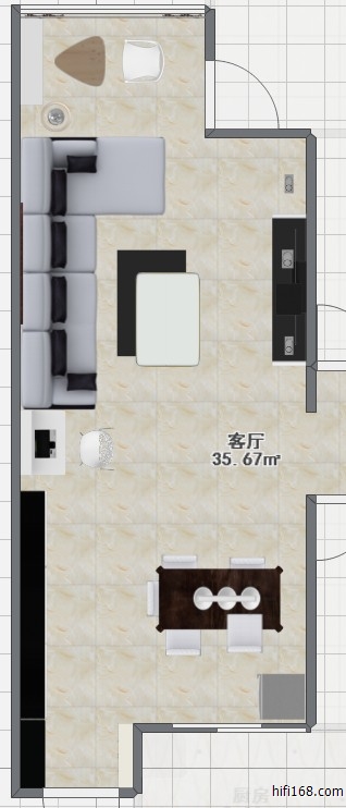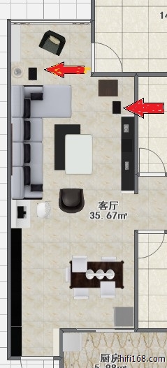 客厅加饭厅35平米,房间宽3.8米,三种摆位方法:1、音箱和电视柜摆右侧长边,2、音箱和电视柜摆左侧长边(倾向于此摆法,箱间距多少合适?),3、音箱摆阳台短边。还有如果走专线的话,线槽公用影响大吗? 全套器材5万以内,要求不是特别高。图1