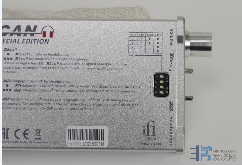 背部还有一组4位的DIP开关,是iFi microiCAN SE的增益调节。开关的旁边同样有文字说明,可以看到iCAN SE总共有三种组合方式,对应0dB、12dB与24dB三组增益,分别对应不同类型的耳塞与耳机。