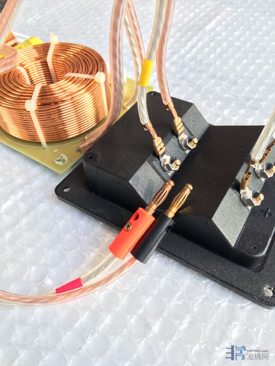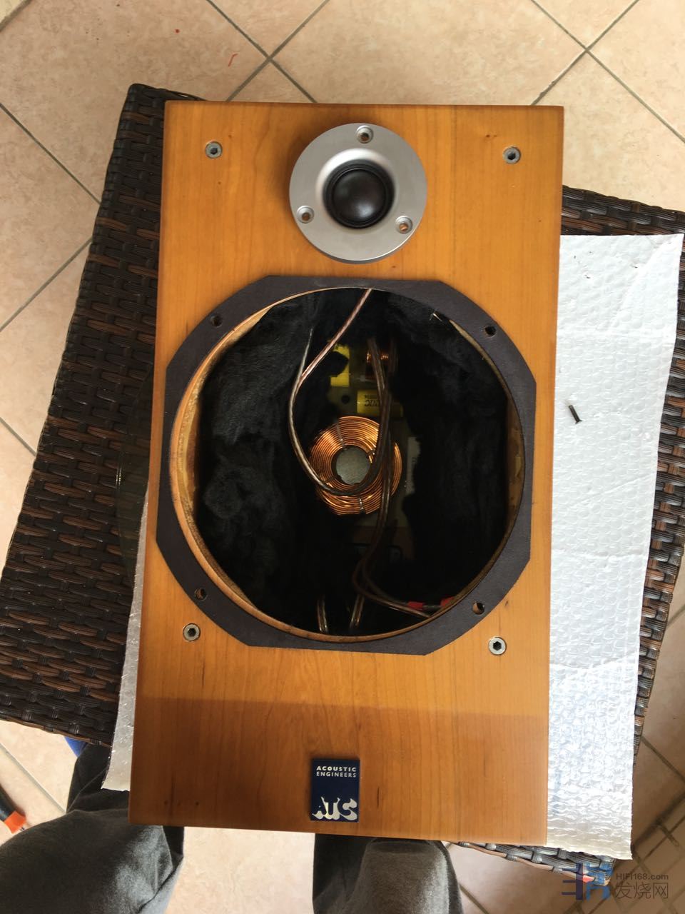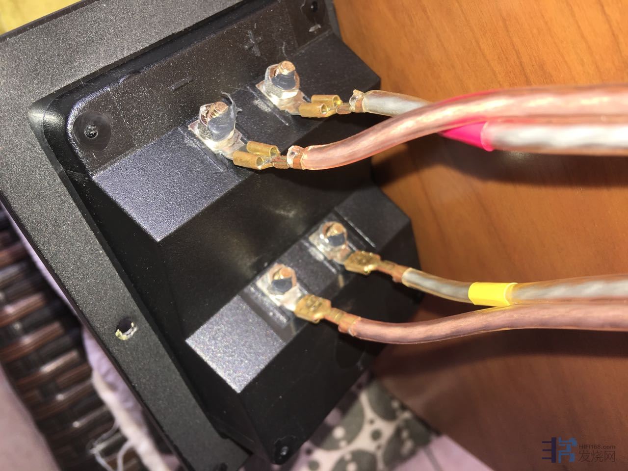 低音接线柱扦着空转的生锈铜香蕉扦。严重损耗传导质量。高音单元用小点点来形容一寸半磁铁。因为钕磁铁的原因吧。