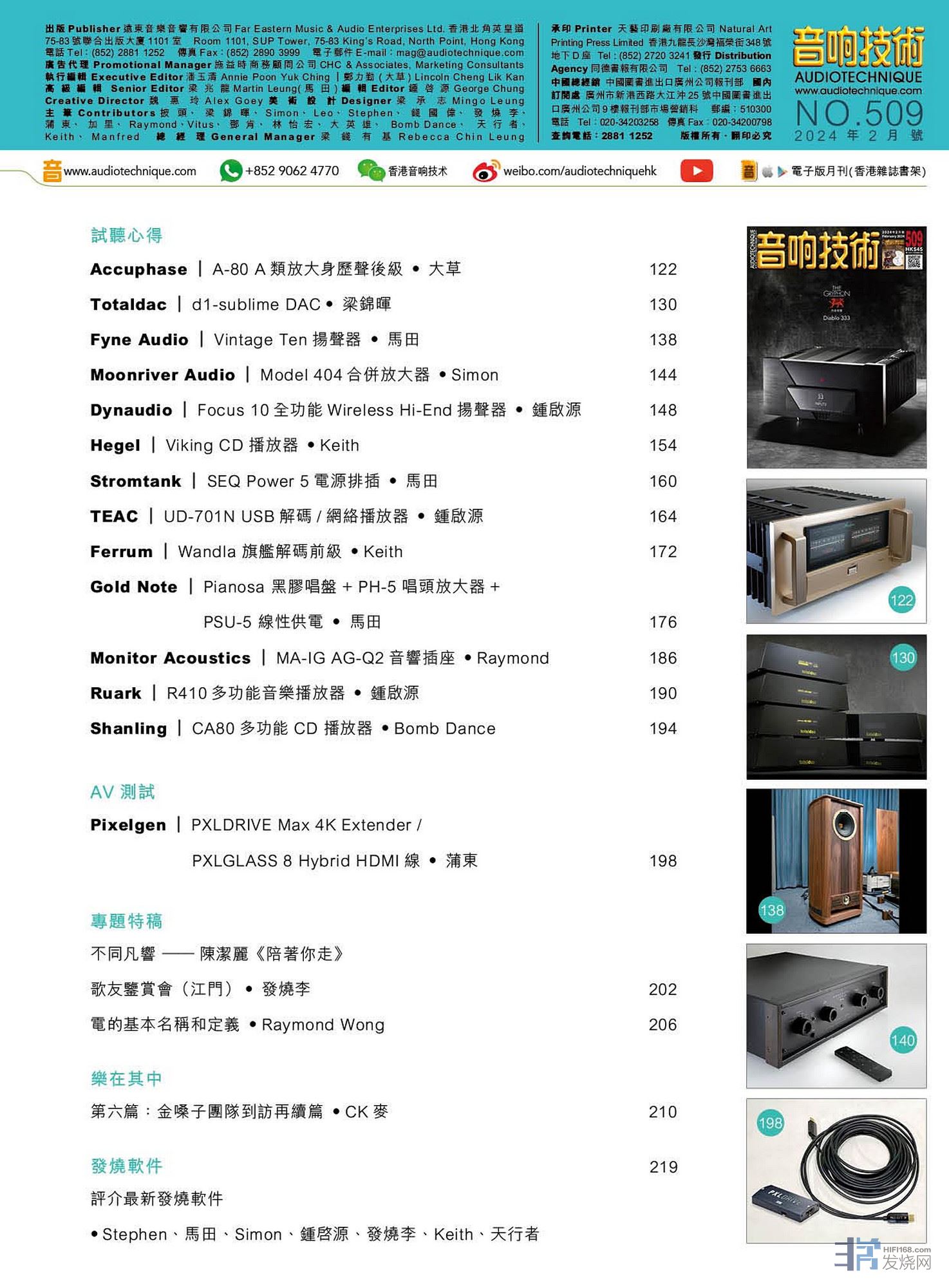 其他评论文章包括:Accuphase A-80 A类放大立体声后级、Totaldac d1-sublime DAC 、Fyne Audio Vintage Ten扬声器、Moonriver Audio Model 404合并放大器、Dynaudio Focus 10全功能Wireless Hi-End扬声器、Hegel Viking CD 播放器 、Stromtank SEQ Power 5电源排插、TEAC UD-701N USB译码/网络播放器 、Ferrum Wandla 旗舰译码前级、Gold Note Pianosa 黑胶唱盘+ PH-5 唱头放大器+PSU-5 线性供电 、Monitor Acoustics MA-IG AG-Q2音响插座、Ruark R410多功能音乐播放器、Shanling CA80多功能CD 播放器、Pixelgen PXLDRIVE Max 4K Extender / PXLGLASS 8 Hybrid HDMI线。详细内容请参阅目录。