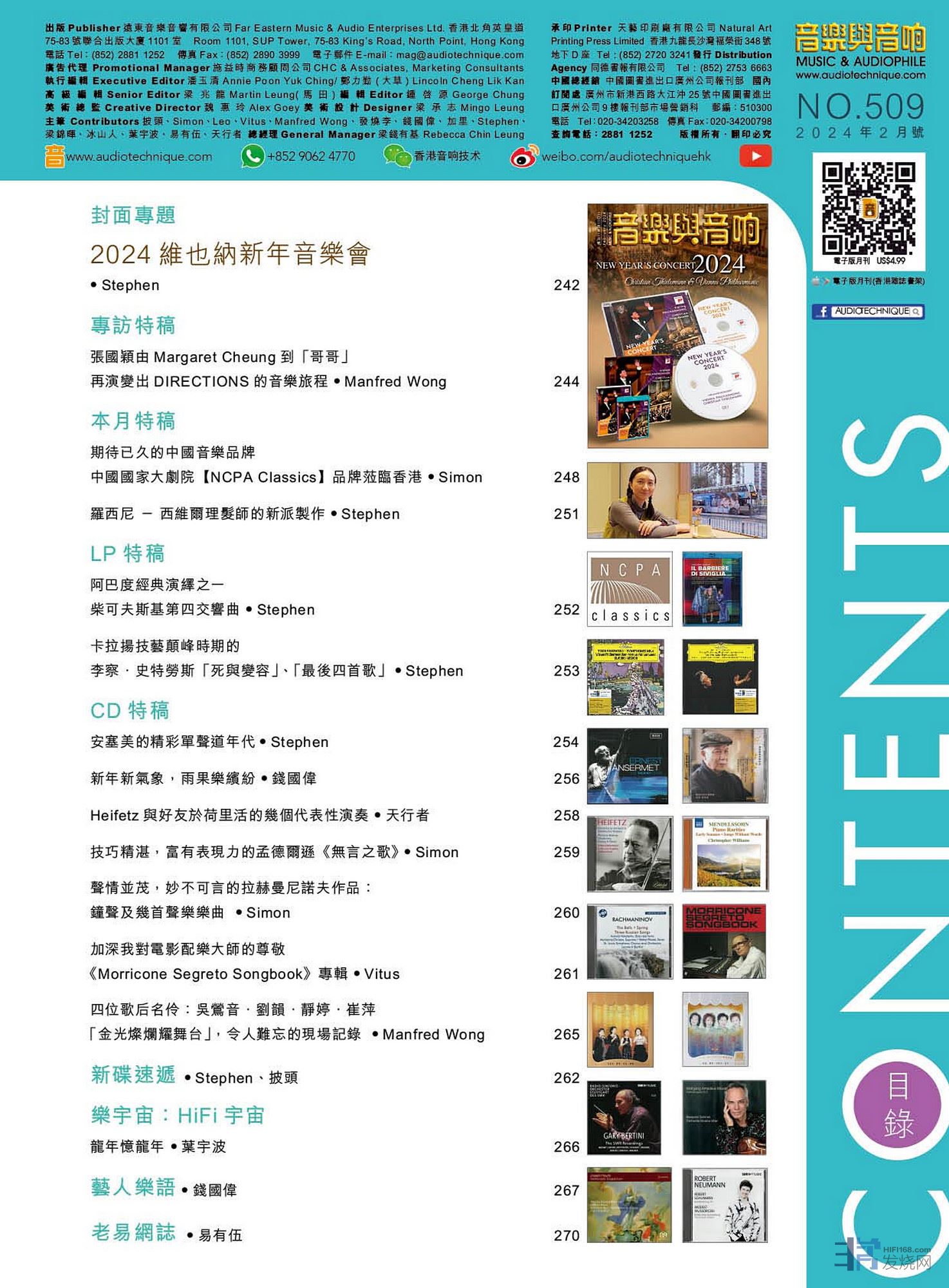 CD特稿 : 安塞美的精彩单声道年代 、新年新气象,雨果乐缤纷、Heifetz与好友于荷里活的几个代表性演奏、技巧精湛,富有表现力的孟德尔逊《无言之歌》、声情并茂,妙不可言的拉赫曼尼诺夫作品:钟声及几首声乐乐曲 、《Morricone Segreto Songbook》专辑、四位歌后名伶:吴莺音.刘韵.静婷.崔萍 「金光灿烂耀舞台」,令人难忘的现场记录。