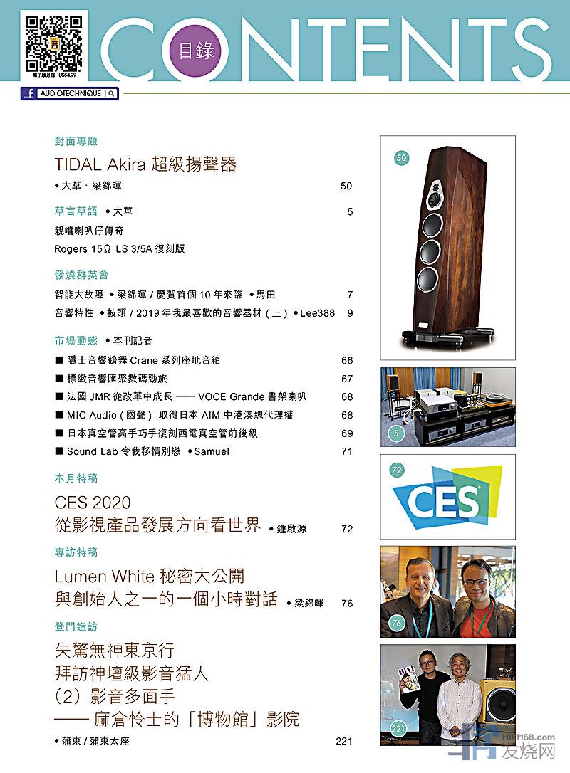今期封面专题由大草、梁锦晖评论TIDAL Akira超级扬声器,本月特稿:CES 2020从影视产品发展方向看世界、专访特稿:Lumen White秘密大公开,梁锦晖与创始人之一的一个小时对话、蒲东失惊无神东京行,拜访影音多面手 —— 麻仓怜士的「博物馆」影院、其他评论文章包括:Accuphase E-800 甲类合并放大器 、Stenheim Alumine Five SE座地扬声器、PATHOS KRATOS 合并扩音机、Audio-Technica AT-SUT1000 唱头升压器 、Entreq Tellus II Infinity无限版大地盒 、KECES Sphono 唱头放大器及Sphono Power分体电源供应器、Merging +Clock-U外置时钟 - Vibrato BA1超级蓝牙播放器 、Cyrus ONE Cast、Critical Mass Systems Center Stage2、Original OPA-5A 胆合并式放大器、Fender AE1i Audio Enhancer、Lotoo PAW 6000 、Shanling M6 Android 无损音乐播放器、DA&T Q-i 译码耳扩、qdc Anole VX-S耳机、Audio-Technica ATH-WP900便携耳筒、Earsonics.Stark耳机...,详细内容请参阅目录。