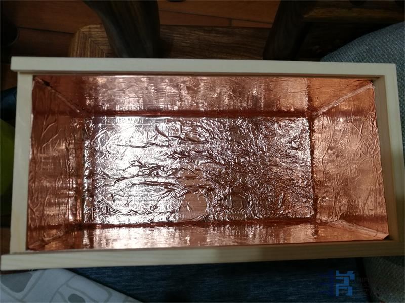 用紫铜箔把木盒子的四周全部粘贴起来,既可以起到屏蔽的作用,又可以起到连通电气石等材料的作用。