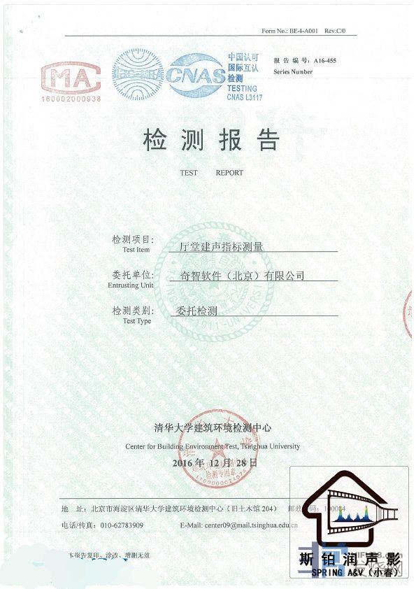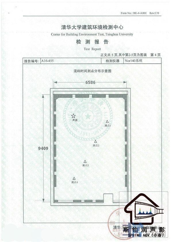 空间对角线平均等分4个点测试125HZ到4KHZ,共24个频点,混响时间全部位于0.33秒到0.43秒内,达到0.38秒正负0.05秒;