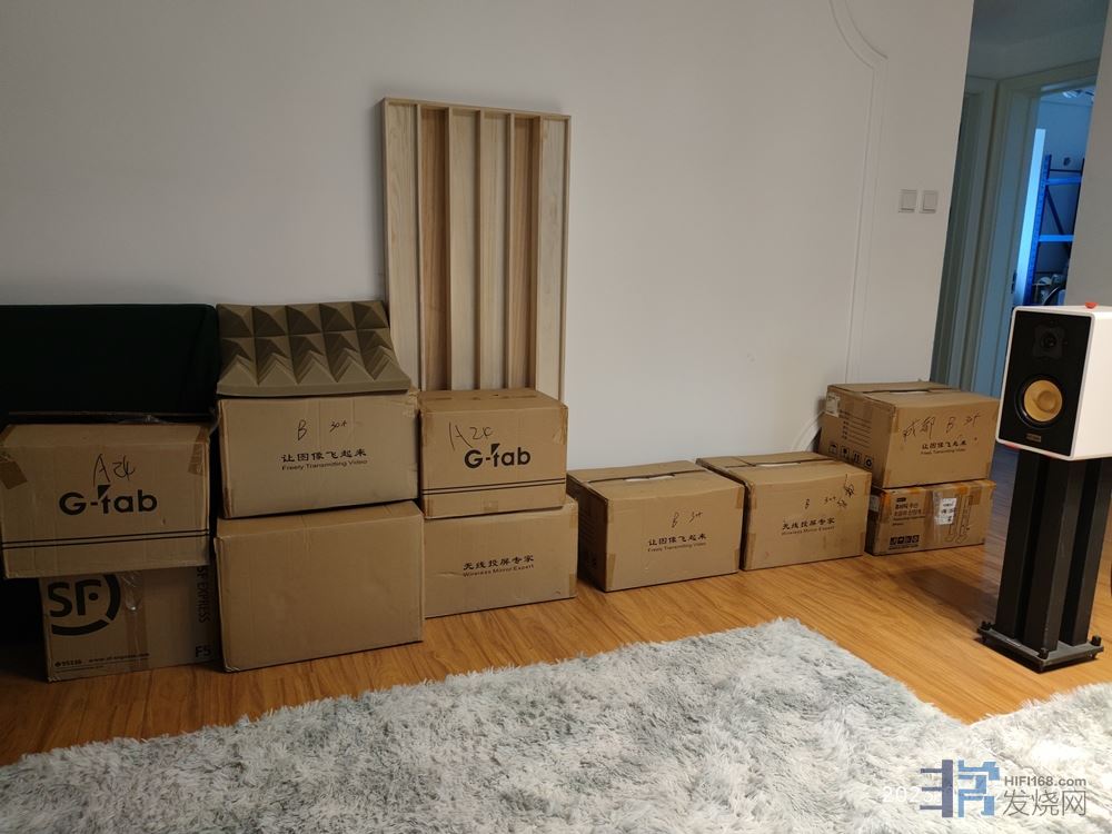 另一个是纸箱,自己以前做耳机生意剩下来了许多,里面全是耳机的包装材料,也就拿它废物利用了(都是钱啊),它吸收中低频的效果相当出色。于是这些天我一直像一只勤劳的小蜜蜂一样,一段时间搬进来,过两天又搬出去。推荐大家把自己平时买东西的纸箱都留住,在里面填上衣服啥的,放房间角落,吸低频的效果好还不用花钱(声学处理时低频陷阱是很昂贵的)。