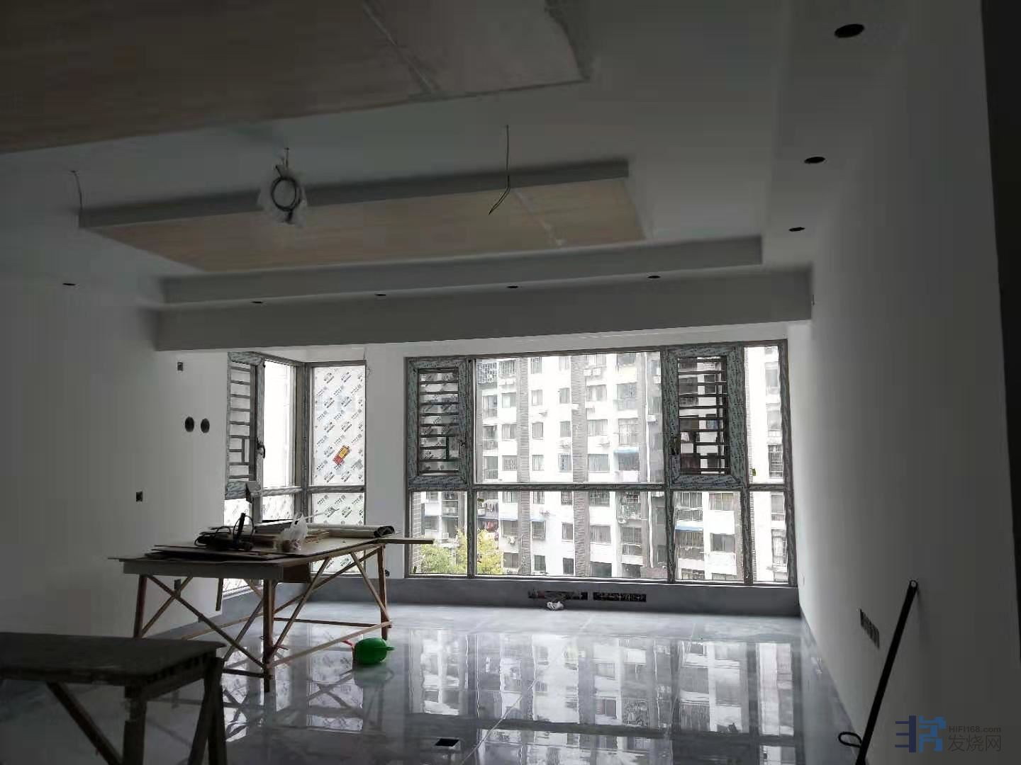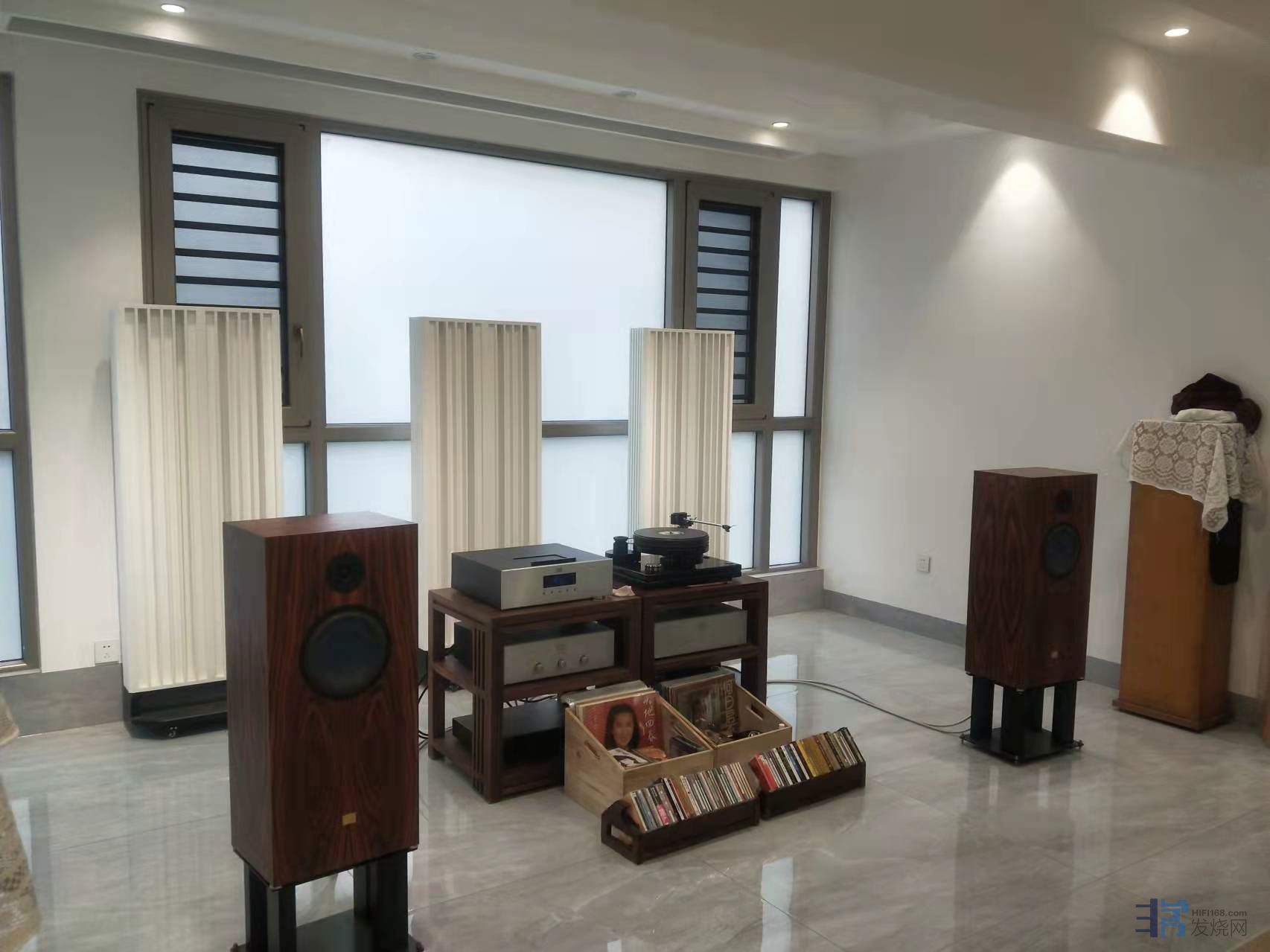 音箱后面的落地玻璃窗,乃是万恶之源,必须处理,不管用什么办法。主要是玻璃的刚度不够,中低音传过去会引起震动,玻璃一旦震动坏处多了,中低音的能量损失,全频段有杂音、毛刺,音色错误,平衡感差,等等等等,毛病多了。所以说是万恶之源!不处理的话,再花一两百万购置、更换器材都没用。处理好了再谈扩散、吸收等等声学处理,再来说好不好听,现在说好听或不好听通通不算数。这是性价比最高的处理办法,也是最有效的办法。