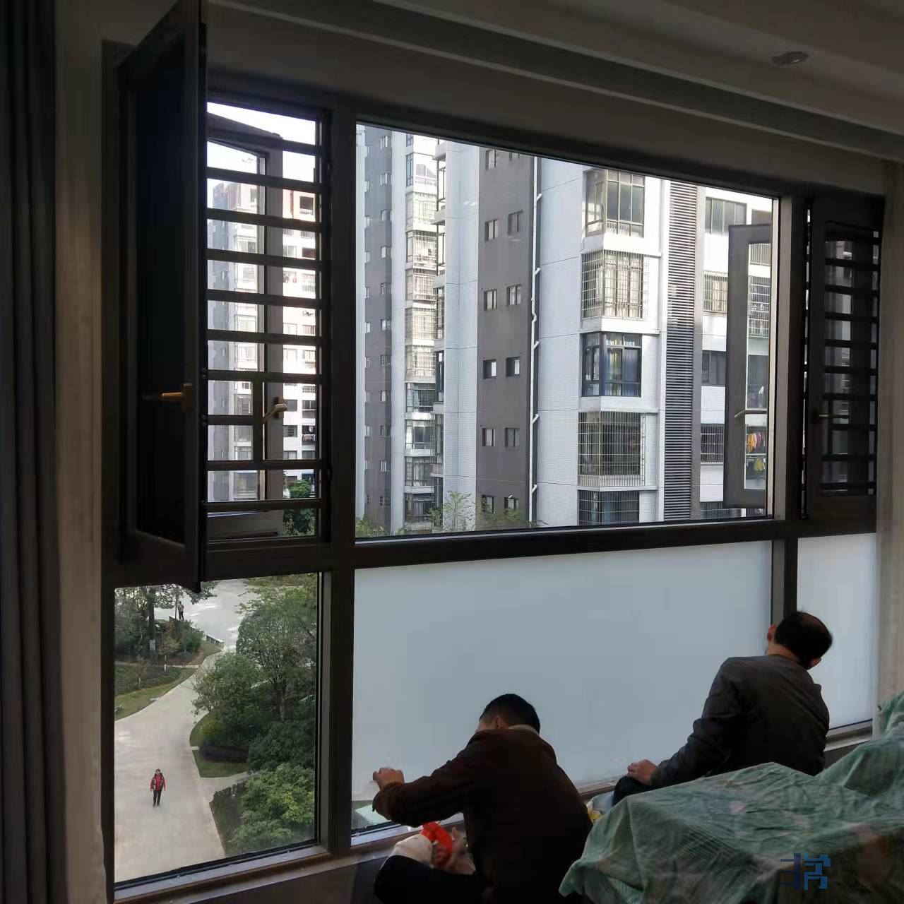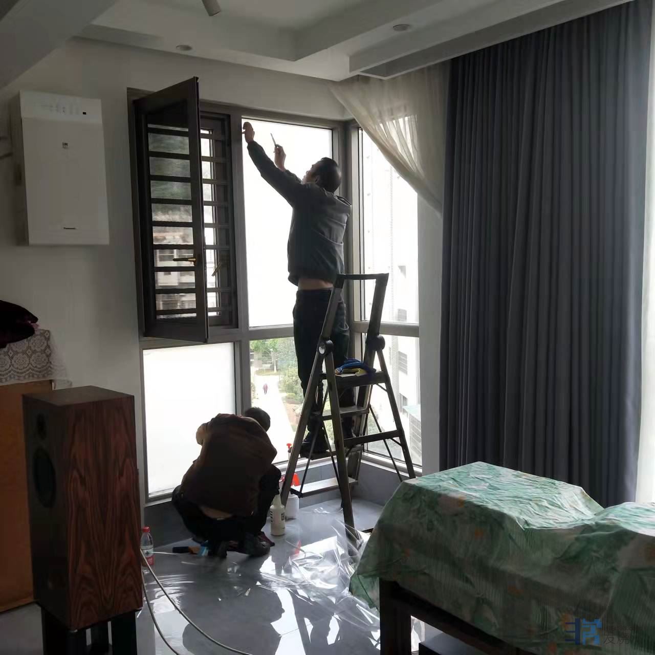 第一步,客厅落地窗包括窗扇全部贴上保护膜。