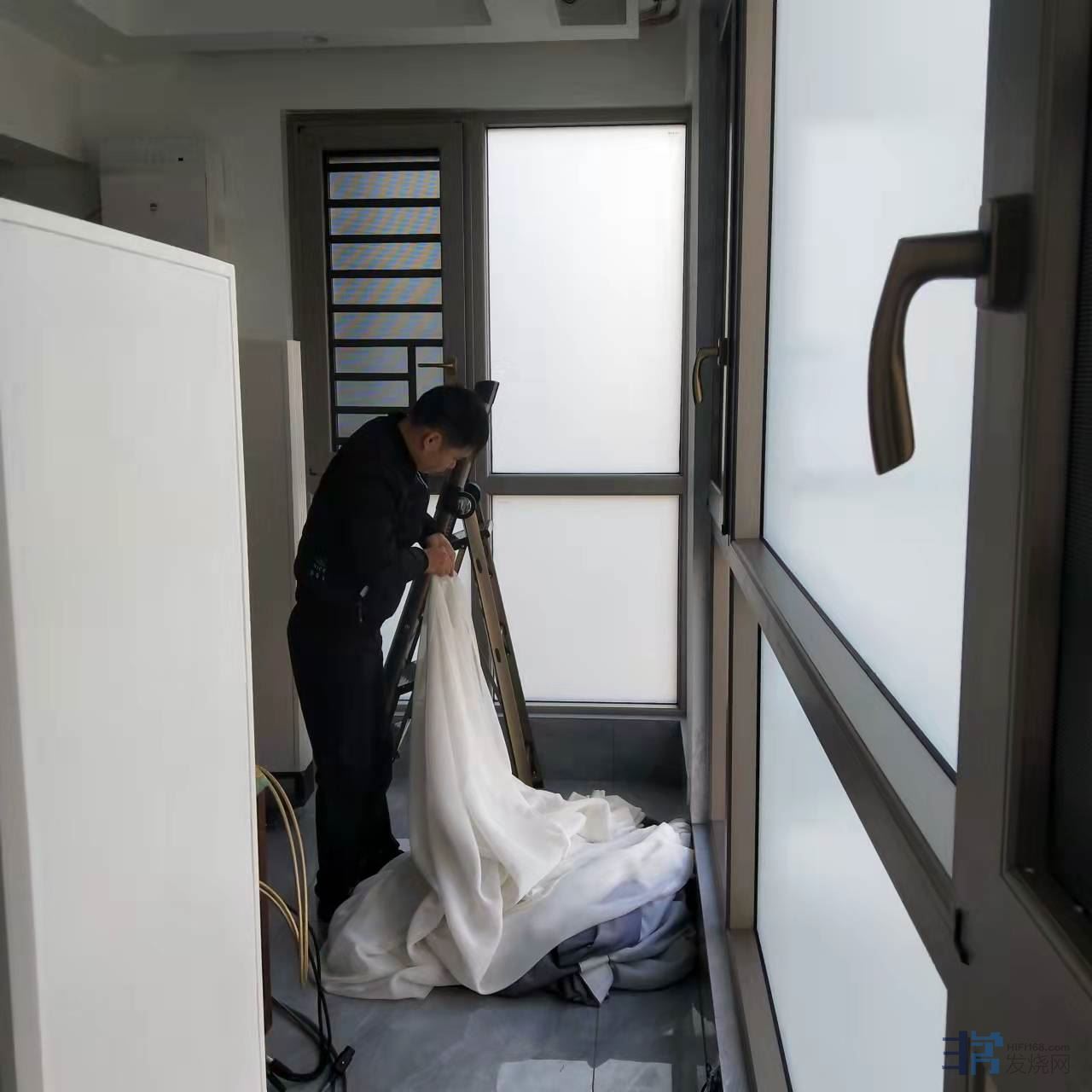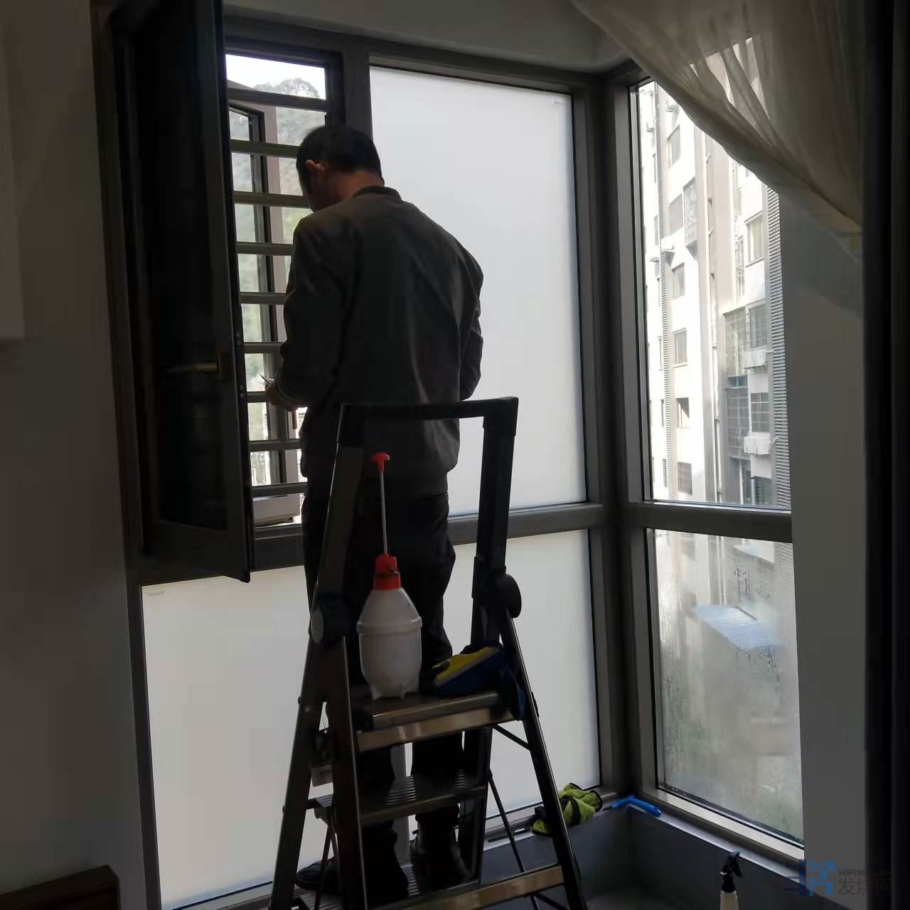 第一步:客厅落地窗包括窗扇全部贴上保护膜,3M白磨砂膜,这一款膜没遮光功能,没挡紫外线功能,没保温隔热的功能,这一切的功能都没有,我只有一个要求:遮挡视线,双向遮挡隐 私!同时耐久。客厅里面无论怎样折腾,闹得天翻地覆都不让人在看见,眼不见为干净!我也不希望有碍于观瞻,影响整栋楼的建筑形象。