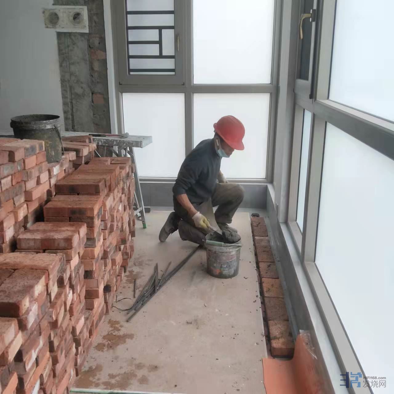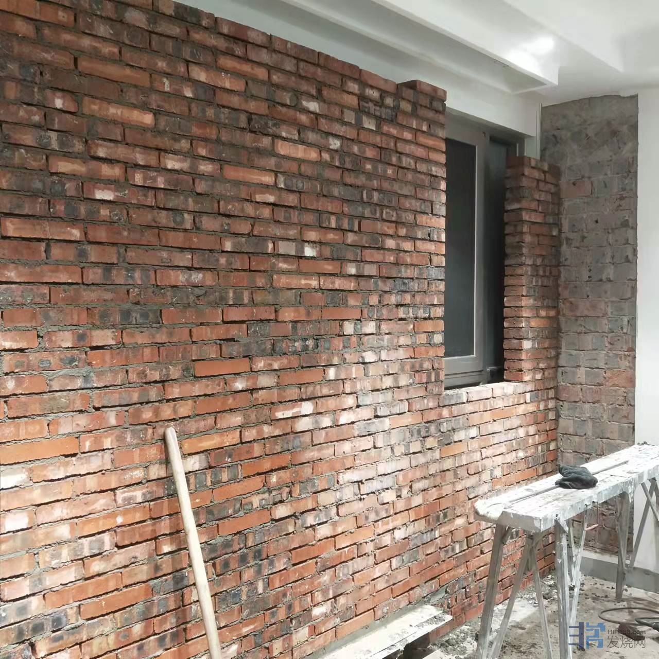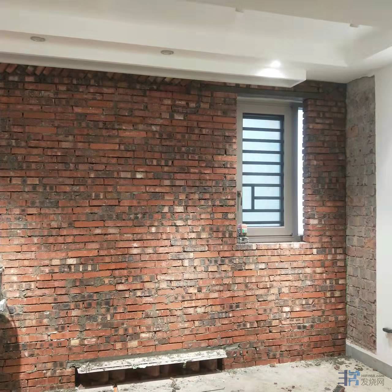 第三步,也是最重要的一步,砖墙伺候!在里面砌砖砖墙,把落地窗封起来,包括相应的墙面抹灰、硅藻泥、踢脚线等等。